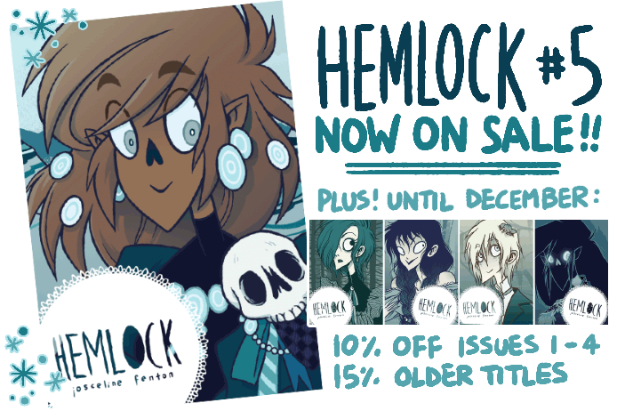 to celebrate, i’m having a sale on all my older titles until december! 10% off previous issues of hemlock and 15% off my even older stuff. please help me spread the word!